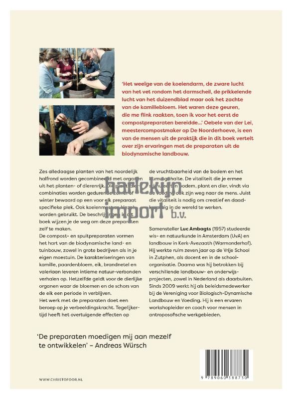 “Het weeïge van de koeiendarm, de zware lucht van het vet rondom het darmscheil, de prikkelende lucht van het duizendblad maar ook het zachte van de kamillebloem. Het waren deze geuren, die me flink raakten, toen ik voor het eerst de compostpreparaten bereidde. . .” Oebele van der Lei, meester- compostmaker op De Noorderhoeve, is een van de mensen uit de praktijk die in dit boek vertelt over zijn ervaringen met de preparaten uit de biodynamische landbouw. Zes alledaagse planten van het noordelijk halfrond worden gecombineerd met organen uit het planten- of dierenrijk. Die plant-diercombinaties worden gedurende zomer of winter bewaard op een voor elk preparaat specifieke plek. Ook koeienmest en kiezel worden gebruikt. De beschrijvingen in dit boek wijzen je de weg om deze preparaten zelf te maken. De compost- en spuitpreparaten vormen het hart van de biodynamische land- en tuinbouw, zowel in grote bedrijven als in je eigen moestuin. De karakteriseringen van kamille, paardenbloem, eik, brandnetel en valeriaan leveren intieme natuur-verbonden verhalen op. Hetzelfde geldt voor de dierlijke organen waar de bloemen en de schors van de eik een periode in verblijven. Het werk met de preparaten doet een beroep op je verbeeldingskracht. Tegelijkertijd heeft het overtuigende effecten op de vruchtbaarheid van de bodem en het humusgehalte. De vitaliteit die je ermee stimuleert in bodem, plant en dier, vindt via de voeding ook zijn weg naar de mens. Juist die vitaliteit is nodig om creatief en daadkrachtig in de wereld te werken. “De preparaten moedigen mij aan mezelf te ontwikkelen” Andreas Würsch. Met bijdragen van o.a. Petra Derkzen, Gineke de Graaf, Ueli Hürter, Oebele van der Lei, Pierre Masson, Jola Meijer, René Piamonte, Georg Soldner, Albert de Vries, Ellen Winkel, Andreas Würsc