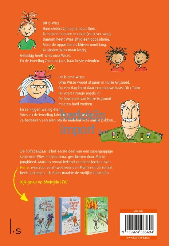 Wies en oma Wisse – De bullebakbaas is het eerste deel van een toegankelijke serie van Pluim-winnares Marte Jongbloed (bekend van Herre) voor kinderen vanaf 6 jaar. In deze supergrappige serie, met fullcolour illustraties van Iris Boter, redt Wies haar oma van een gemene directeur. De ouders van Wies zijn vaak voor hun werk in het buitenland. Daarom gaat ze elke dag naar haar oma, die in een verzorgingstehuis woont. En naar haar twee beste vrienden, de tweeling Zane en Jazz. In het tehuis van oma Wisse komt een nieuwe directeur: Dick Tator. Hij is net ontslagen bij het leger. Hij voert meteen een heleboel strenge regels in. Eigenlijk heeft hij een hekel aan ouderen. Ze zijn traag en luisteren slecht naar bevelen. Wanneer de bewoners zelfs geld moeten verdienen voor Dick Tator, besluiten Wies en de tweeling dat het zo niet langer kan... Marte Jongbloed won al twee keer een Pluim van de Senaat van de Nederlandse Kinderjury voor haar boeken over Herre, waarvoor Iris Boter de illustraties maakte. Wies en oma Wisse is door de korte zinnen heel geschikt voor jonge en minder ervaren lezers.
