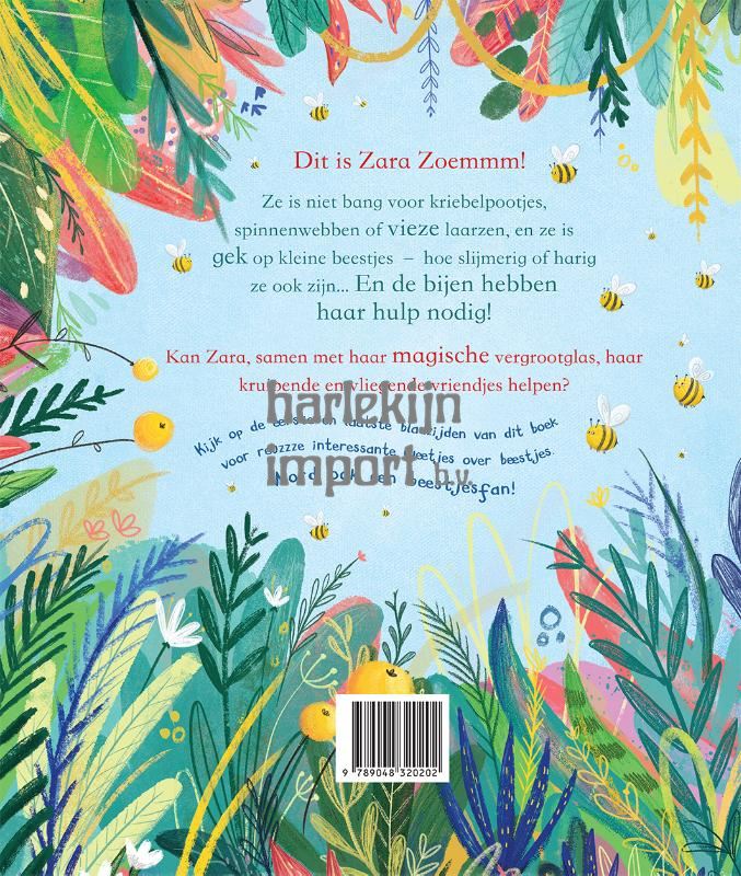 Dit is Zara Zoemmm! Ze is niet bang voor kriebelpootjes, spinnenwebben of vieze laarzen, en ze is gek op kleine beestjes – hoe slijmerig of harig ze ook zijn... En de bijen hebben haar hulp nodig! Kan Zara, samen met haar magische vergrootglas, haar kruipende en vliegende vriendjes helpen? Catherine Jacob is een auteur, awardwinnende tv-correspondent en moeder van drie kleine kinderen. Voor haar werk als milieucorrespondent reisde ze de hele wereld rond, van het Amazonewoud tot aan de poolcirkel. Lucy Fleming studeerde Illustratie aan de University of Lincoln, en haar stijl kenmerkt zich door magische elementen. Haar vrije tijd brengt ze het liefst in de buitenlucht door. Met reuzzze interessante weetjes over beestjes!