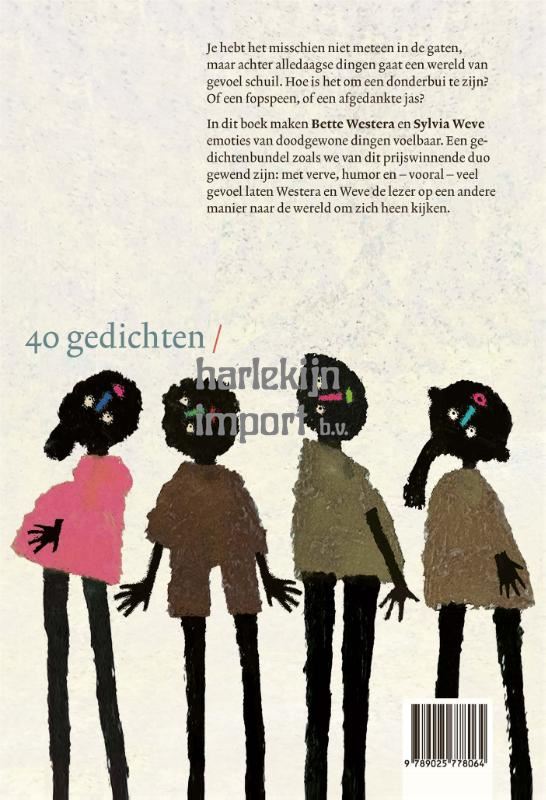 In 'Zo voelt dat' duiken de veelbekroonde Bette Westera en Sylvia Weve in de emoties en gevoelens van de dingen in ons leven. Achter alledaagse dingen gaat een wereld van emoties schuil. Een donderbui kan heel opvliegend zijn, een losgelaten knoop bedroefd en een lantaarnpaal onbewogen. In treffende gedichten ontsluit Bette Westera het gevoel van doodgewone dingen. De expressieve illustraties van Sylvia Weve zetten die veelheid van gevoelens kracht bij. 'Zo voelt dat' is een gedichtenbundel zoals we van het gouden duo achter o.a. 'Doodgewoon' en 'Uit elkaar' gewend zijn: met verve, humor en - vooral - veel gevoel laten Westera en Weve de lezer op een andere manier naar de wereld om zich heen kijken. 'Uit elkaar' won een Gouden Griffel, een Zilveren Penseel en de Woutertje Pieterse Prijs. Eerder maakten Westera en Weve samen onder andere het boek 'Doodgewoon', dat werd bekroond met een Gouden Griffel, een Vlag & Wimpel van de Penseeljury, de Gouden Poëziemedaille én de Woutertje Pieterse Prijs. In 2019 kreeg Sylvia Weve voor haar indrukwekkende en veelzijdige oeuvre de prestigieuze Max Velthuijs-prijs.