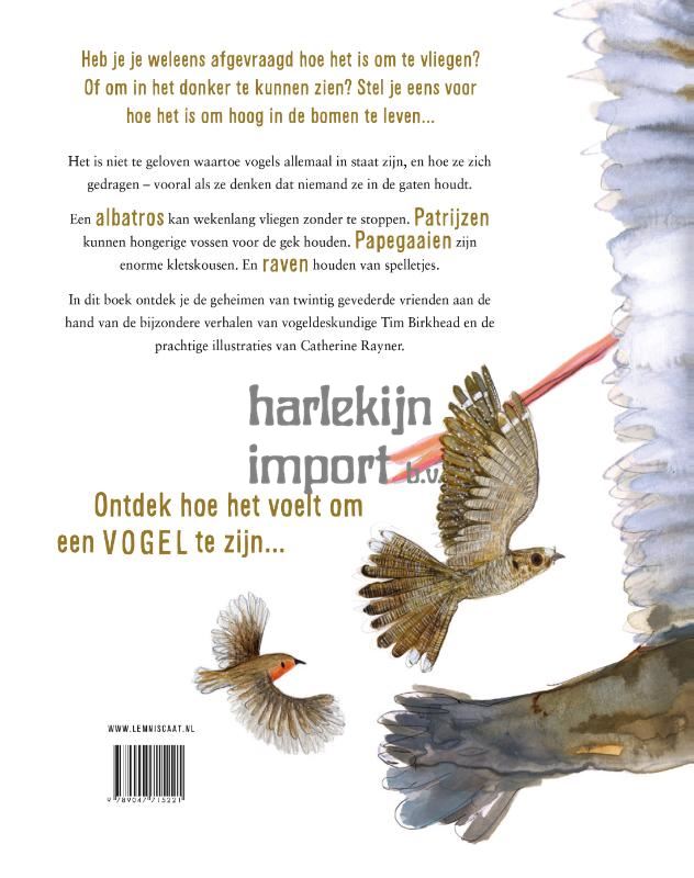 Heb je je weleens voorgesteld hoe het zou zijn om te vliegen? Of om hoog in de bomen te leven? Misschien heb je je weleens afgevraagd wat vogels doen als niemand kijkt…Vogels kunnen zich op heel bijzondere – en eigenaardige – manieren gedragen. Raven houden bijvoorbeeld van spelen. In de winter sleeën ze op hun buik over besneeuwde daken naar beneden, steeds sneller en sneller. Patrijzen zijn slim en weten precies hoe ze hongerige vossen moeten misleiden: de moeder doet alsof haar vleugel gebroken is en leidt de vos van haar jongen af… en gaat er dan op het laatste moment vandoor. En honingspeurders helpen mensen de zoetste traktatie in het bos te vinden: honing. Dit zijn nog maar een paar van de ongelofelijke verhalen die je in dit boek vindt. Door de fascinerende feitjes en speelse verhalen van ornitholoog Tim Birkhead en levendige, karaktervolle illustraties van Catherine Rayner ontdek je hoe het voelt om een vogel te zijn.
