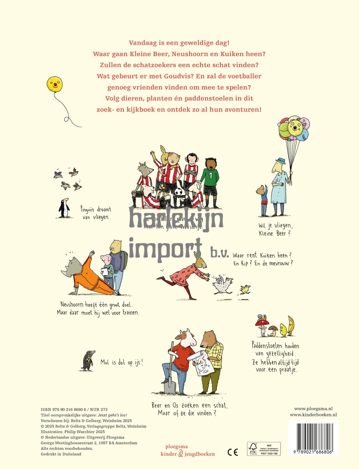 Een groot en stevig zoekboek om uren naar te kijken van Philip Waechter, voor fans van Rotraut Susanne Berner en Göbel & Knorr. Vandaag is een geweldige dag! Waar gaan Kleine Beer, Neushoorn en Kuiken heen? Wat gebeurt er met Goudvis? En zal de voetballer genoeg vrienden vinden om mee te spelen? Volg dieren, planten, paddenstoelen, fruit én bloemen in dit zoek- en kijkboek en ontdek zo al hun avonturen.