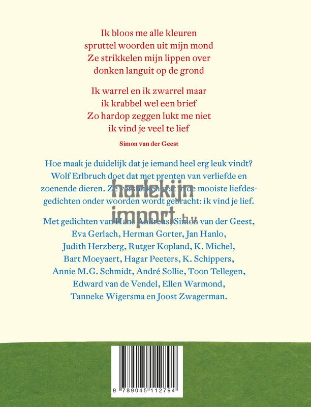 Hoe maak je duidelijk dat je iemand heel erg leuk vindt? Wolf Erlbruch doet dat met prenten van verliefde en zoenende dieren. Ze versterken wat in de prachtige gedichten onder woorden wordt gebracht: ik vind je lief.