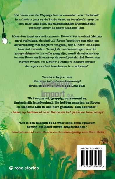 Het leven van de 12-jarige Rocca verandert snel. Ze beleeft haar laatste jaar op de basisschool en toverkookt erop los met haar oma Sala, die geheimzinnige tovermiddelen verkoopt onder de naam Madame Lilu. Maar dan komt er slecht nieuws: Rocca’s beste vriend Mounir moet verhuizen, de stad uit! Rocca broedt op een plan om de verhuizing met magie te stoppen, ook al heeft Oma Sala haar dat verboden. Terwijl de voorbereidingen voor de groepachtmusical in volle gang zijn, wordt de vriendschap tussen Rocca en Mounir op de proef gesteld. Zal Rocca een manier vinden om Mounir dichtbij te houden zonder de regels van het toverkoken te overtreden? Van de schrijver van: Rocca en het geheime toverrecept Rocca en de verdwijning van Oma Sala ‘Wat een mooi, grappig, ontroerend en fantasierijk jeugdverhaal. We hebben genoten en Rocca en Madame Lilu in ons hart gesloten. Een aanrader!’- Lezer op hebban.nl over Rocca en het geheime toverrecept ‘Dit is een heerlijk boek waar mijn zoon opnieuw hardop om heeft zitten schaterlachen.’- loortjeleest.nl over Rocca en de verdwijning van Oma Sala