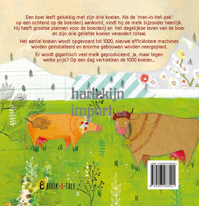1000 KOEIEN Een boer leeft gelukkig met zijn drie koeien. Als de man in het pak op een ochtend op de boerderij aankomt en de melk heerlijk vindt, ontstaat er een nieuwe dynamiek. De man in het pak heeft grootse plannen. Meer melk produceren, het aantal koeien verhogen, nieuwe efficiëntere machines installeren, grotere gebouwen neerplanten. Er moet worden voldaan aan de groeiende vraag van enthousiaste consumenten en dat betekent dat het dagelijkse leven van de boer en zijn koeien geleidelijk verandert. Meer produceren, ja, maar tegen welke prijs? Op een dag vertrekken de 1000 koeien… Een gevoelig , humoristisch en kleurrijk prentenboek over eenvoudige genoegens, duurzame productie en respect voor dieren.
