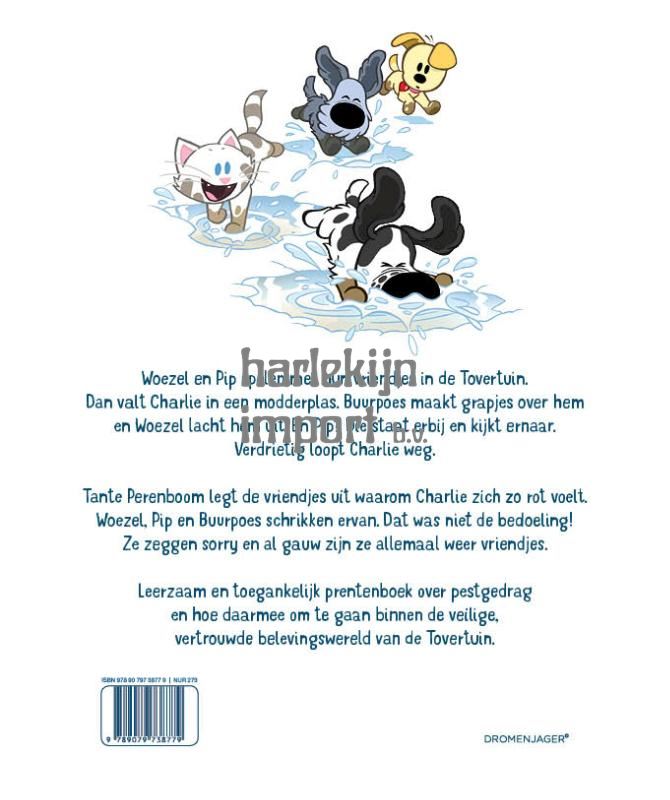 Woezel en Pip spelen met hun vriendjes in de Tovertuin. Dan valt Charlie in een modderplas. Buurpoes maakt grapjes over hem en Woezel lacht hem uit. En Pip? Die staat erbij en kijkt ernaar. Verdrietig loopt Charlie weg. Tante Perenboom legt de vriendjes uit waarom Charlie zich zo rot voelt. Woezel, Pip en Buurpoes schrikken ervan. Dat was niet de bedoeling! Ze zeggen sorry en al gauw zijn ze allemaal weer vriendjes.