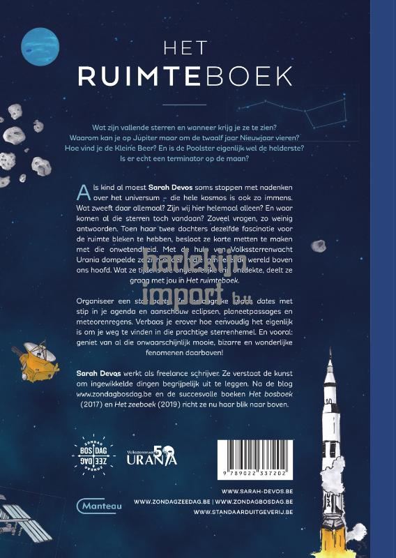 Wat zijn vallende sterren en wanneer krijg je ze te zien? Waarom kan je op Jupiter maar om de twaalf jaar Nieuwjaar vieren? Hoe vind je de Kleine Beer? En is de Poolster eigenlijk wel de helderste? Is er echt een terminator op de maan? Als kind al moest Sarah Devos soms stoppen met nadenken over het universum – die hele kosmos is ook zo immens. Wat zweeft daar allemaal? Zijn wij hier helemaal alleen? En waar komen al die sterren toch vandaan? Zoveel vragen, zo weinig antwoorden. Toen haar twee dochters dezelfde fascinatie voor de ruimte bleken te hebben, besloot ze korte metten te maken met die onwetendheid. Met de hulp van Volkssterrenwacht Urania dompelde ze zich onder in die intrigerende wereld boven ons hoofd. Wat ze tijdens die ongelofelijke trip ontdekte, deelt ze graag met jou in Het ruimteboek. Organiseer een star party. Zet belangrijke space dates met stip in je agenda en aanschouw eclipsen, planeetpassages en meteorenregens. Verbaas je erover hoe eenvoudig het eigenlijk is om je weg te vinden in die prachtige sterrenhemel. En vooral: geniet van al die onwaarschijnlijk mooie, bizarre en wonderlijke fenomenen daarboven!