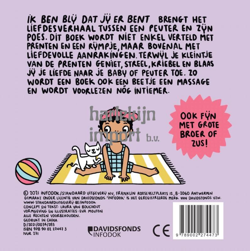 Ik ben blij dat jij er bent wordt niet enkel verteld met prenten en tekst, maar bovenal met liefdevolle aanrakingen. Terwijl je voorleest, streel, kriebel, blaas je je liefde naar je baby of peuter toe. Tot zijn lijfje en hart er doordrongen van zijn. Zo wordt een boek ook een beetje een massage. En wordt voorlezen nóg intiemer.