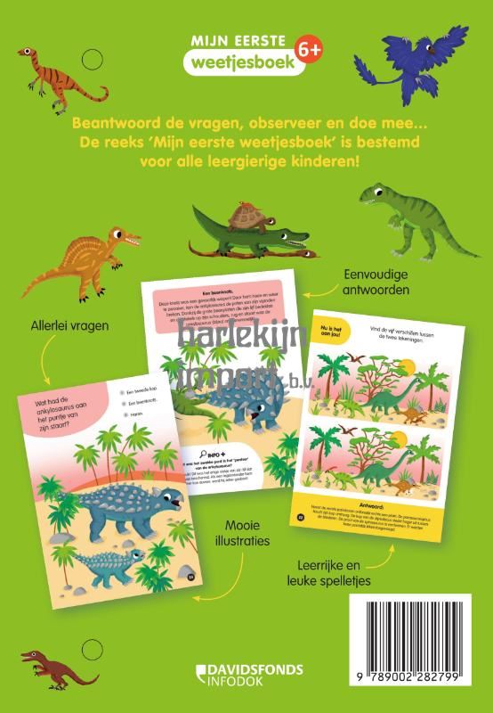 Dit boek bevat meer dan 60 vragen en antwoorden over dinosaurussen.Probeer eerst zelf de meerkeuzevraag te beantwoorden en ontdek nadien het juiste antwoord met een extra woordje uitleg. Door de opbouwende moeilijkheidsgraad groeit het boek mee met de lezer. Leer alles over dinosaurussen in dit groeiboek aan de hand van 3 soorten vragen:• moeilijke vragen, die twee pagina's beslaan door de uitgebreide uitleg.• makkelijke vragen, op één pagina, met iets toegankelijkere informatie.• spelvragen: grote geïllustreerde scènes, op één of twee pagina's, die kinderen in staat stellen te leren door te observeren, benoemen, tellen, enz.
