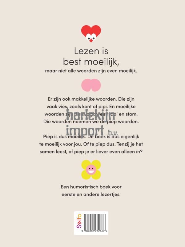 Lezen is best moeilijk, maar niet alle woorden zijn even moeilijk. Er zijn ook makkelijke woorden. Die zijn vaak vies, zoals kont of pipi. En moeilijke woorden zijn dan vaak weer saai en stom.Die woorden noemen we de piep woorden. Piep is dus moeilijk. Dit boek is dus eigenlijk te moeilijk voor jou. Of te piep dus. Tenzij je het samen leest, of piep je er liever even alleen in? Een humoristisch boek voor eerste en andere lezertjes.
