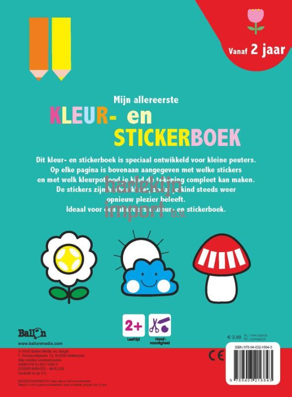 Dit kleur- en stickerboek is speciaal ontwikkeld voor kleine peuters. Op elke pagina is bovenaan aangegeven met welke stickers en met welk kleurpotlood je kind de tekening compleet kan maken. De 60 stickers zijn herbruikbaar, zodat je kind steeds opnieuw plezier beleeft. Ideaal voor een allereerste kleur- en stickerboek vanaf twee jaar.