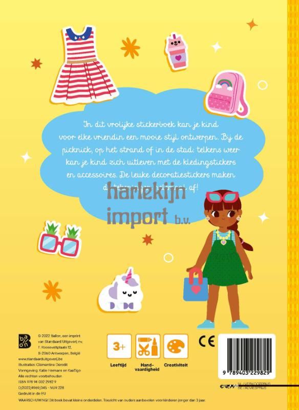 In dit vrolijke stickerboek kan je kind voor elk meisje een mooie stijl ontwerpen. Bij de picknick, op het strand of in de stad: telkens weer kan je kind zich uitleven met de meer dan 150 kledingstickers en accessoires. De leuke decoratiestickers maken de tekeningen helemaal af!