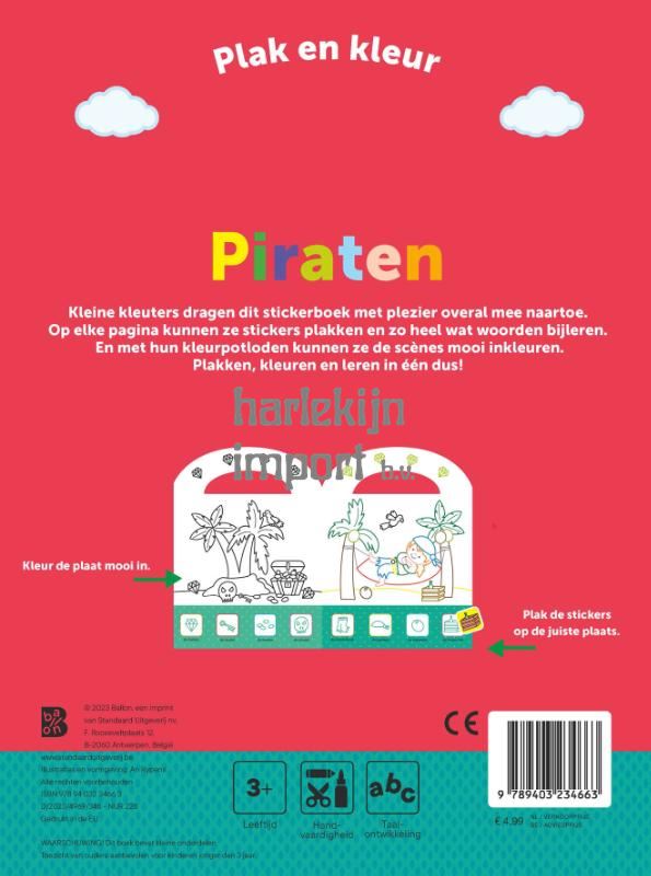 Kleine kleuters van 3 jaar dragen dit stickerboek vol piraten met plezier overal mee naartoe. Op elke pagina kunnen ze stickers plakken en zo heel wat woorden bijleren. En met hun kleurpotloden kunnen ze de scènes mooi inkleuren. Plakken, kleuren en leren in één dus!