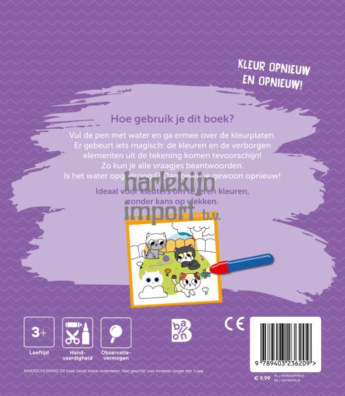 Kleur alle tekeningen van deze schattige babydieren in met water. Vul de pen met water en ga ermee over de kleurplaten. Er gebeurt iets magisch: de kleuren en de verborgen elementen uit de tekening komen tevoorschijn! Zo kun je alle zoekvraagjes beantwoorden. Kan jij het blauwe vogeltje in elke tekening vinden? Is het water gedroogd? Dan begin je gewoon opnieuw! Ideaal voor kleuters om te leren kleuren, zonder kans op vlekken.