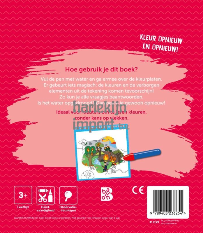 Tuta tuta! Kleine brandweerlui zullen heel wat plezier beleven met dit magische kleurboek. Vul de pen met water en ga ermee over de kleurplaten. Er gebeurt iets magisch: de kleuren en de verborgen elementen uit de tekening komen tevoorschijn! Zo kun je alle zoekvraagjes beantwoorden. Kan jij de brandweerhelm in elke tekening vinden? Is het water gedroogd? Dan begin je gewoon opnieuw! Ideaal voor kleuters om te leren kleuren, zonder kans op vlekken.