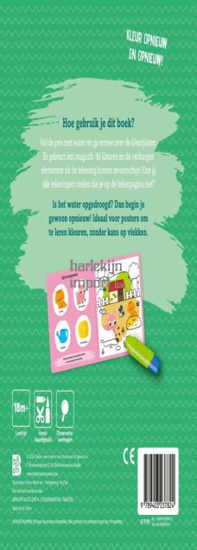 Het populaire concept 'Kleuren met water' bestaat nu ook voor de allerkleinsten, met een aangepaste pen en in kartonboekformaat. Peuters vanaf 18 maanden kunnen zo leren kleuren zonder vlekken te maken. Door de aangepaste zoekopdrachten leren ze bovendien heel wat bij.
