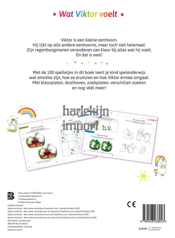 Viktor is een kleine eenhoorn. Hij lijkt op alle andere eenhoorns, maar toch niet helemaal. Zijn regenboogmanen veranderen van kleur bij alles wat hij voelt. En dat is veel! Met de 100 spelletjes in dit boek leert je kind spelenderwijs wat emoties zijn, hoe ze eruitzien en hoe Viktor ermee omgaat. Met kleurplaten, doolhoven, zoekplaten, verschillen zoeken en nog véél meer!