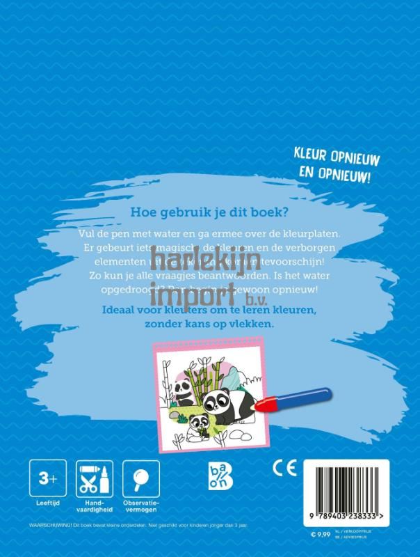 Met dit boek vol dieren is er echte magie in het spel! Vul de bijhorende pen met water en kleur ermee op de pagina’s. Alle kleuren komen tevoorschijn. Nadat alles weer is opgedroogd, verdwijnen de kleuren weer zodat je elke keer opnieuw kunt beginnen. Bij elke tekening staan ook enkele zoekvraagjes die je pas kunt oplossen wanneer je alle details tevoorschijn hebt getoverd. Ideaal voor kleuters om te leren kleuren, zonder kans op vlekken.
