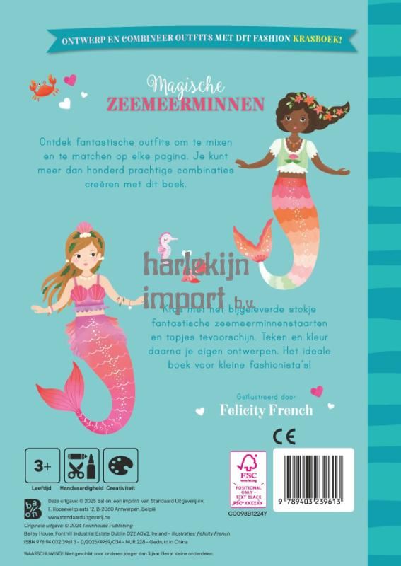 Ontdek fantastische outfits om te mixen en te matchen op elke pagina. Je kunt meer dan honderd prachtige combinaties creëren met dit boek. Kras met het bijgeleverde stokje fantastische zeemeerminnenstaarten en topjes tevoorschijn. Teken en kleur daarna je eigen ontwerpen. Het ideale boek voor kleine fashionista‘s!