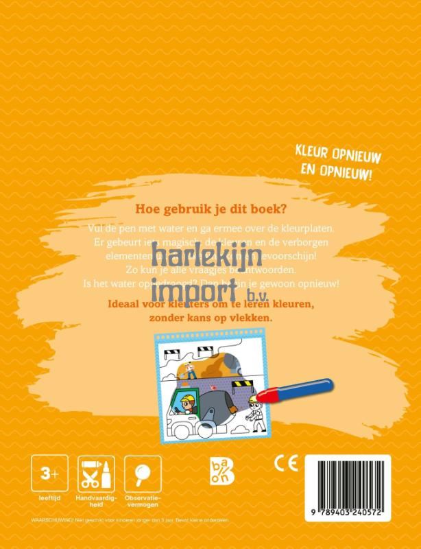Met dit boek ontdek je de bouwplaats. Bovendien is er echte magie in het spel! Vul de bijhorende pen met water en kleur ermee op de pagina’s. Alle kleuren komen tevoorschijn. Nadat alles weer is opgedroogd, verdwijnen de kleuren weer zodat je elke keer opnieuw kunt beginnen. Bij elke tekening staan ook enkele zoekvraagjes die je pas kunt oplossen wanneer je alle details tevoorschijn hebt getoverd. Ideaal voor kleuters om te leren kleuren, zonder kans op vlekken.