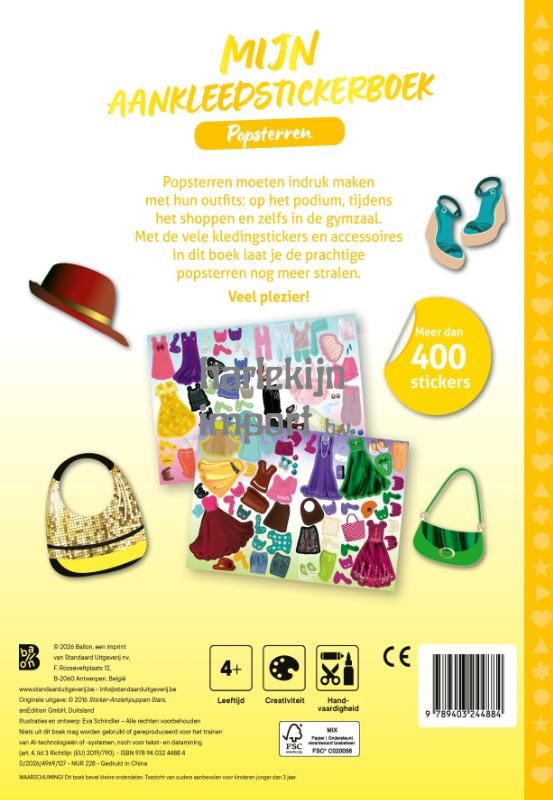 Popsterren moeten indruk maken met hun outfits: op het podium, tijdens het shoppen en zelfs in de gymzaal.Met de vele kledingstickers en accessoires in dit boek laat je de prachtige popsterren nog meer stralen.Veel plezier!