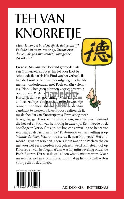 TEH VAN KNORRETJE Maar Iejoor zei bij zichzelf: 'Al dat geschrijf! Potloden en noem-maar-op. Zwaar overdreven, als je 't mij vraagt. Dom gedoe. Zit niks in.' En zo is Tao van Poeh bekend geworden als een Opmerkelijk Succes. En tot voor kort beschouwde ik dat als Het Eind van het verhaal. Ik had de Taoïstische principes uitgelegd. Ik had de mensen onderhouden met Poeh en zijn vriendjes. 'Nee, ik heb geen plannen voor een vervolg op Tao van Poeh. Ik hou niet van vervolgen. Hartelijk dank en goeiendag.' Maar langzaam en heel zachtjes sloop er iets mijn bewustzijn binnen. Een klein stemmetje probeerde mijn aandacht te trekken. Na een poos realiseerde ik me dat het dat van Knorretje was. Er was nog meer te zeggen, gaf Knorrie me te verstaan, maar er was niemand die het zei en toch was het nodig in deze tijd. Een tweede boek hoefde geen 'vervolg' te zijn; het kon een aanvulling op het eerste worden, zoals Het huis in het Poeh-hoekje een aanvulling is op Winnie-de-Poeh. Waarom luisterde ik naar Knorretje? Het antwoord ligt in het verleden. Toen ik klein was en de Poeh-verhalen me voor het eerst werden voorgelezen, werd ik meteen dol op Knorretje - van het begin af aan was hij mijn lieveling onder de Poeh-figuren. Dat wist ik wel, alleen wist ik niet waarom. Maar nu weet ik wel waarom. En ik hoop dat jij het ook zult weten voor je dit boek uit hebt.