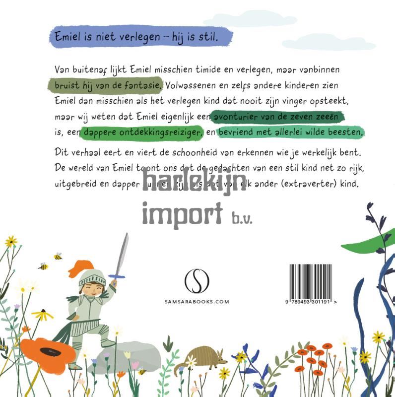 Emiel is niet verlegen – hij is stil. Van buitenaf lijkt Emiel misschien timide en verlegen, maar vanbinnen bruist hij van de fantasie. Volwassenen en zelfs andere kinderen zien Emiel dan misschien als het verlegen kind dat nooit zijn vinger opsteekt, maar wij weten dat Emiel eigenlijk een avonturier van de zeven zeeën is, een dappere ontdekkingsreiziger, en bevriend met allerlei wilde beesten. Dit verhaal eert en viert de schoonheid van jezelf erkennen om wie je werkelijk bent. De wereld van Emiel toont ons dat de gedachten van een stil kind net zo rijk, uitgebreid en dapper kunnen zijn als dat van elk ander (meer extrovert) kind.