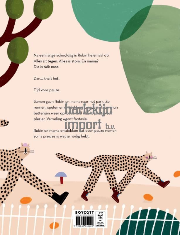 Robin heeft een lange dag achter de rug en is helemaal op. Alles is te veel, tot ze eindelijk ontploft. Mama beseft dat ook zíj een pauze nodig heeft. In het park, tussen frisse lucht, vallende bladeren en wilde cheeta- renrondes, vinden ze hun energie terug. Boosheid maakt plaats voor plezier, verveling voor creativiteit. Samen maken ze een schatkaart van alles wat ze ontdekten en merken ze dat pauzes echte schatten zijn. Soms is alles gewoon even te veel — voor kinderen én voor ouders. Robin heeft even pauze nodig laat op een invoelende manier zien hoe belangrijk het is om op tijd rust te nemen en nieuwe energie op te doen.
