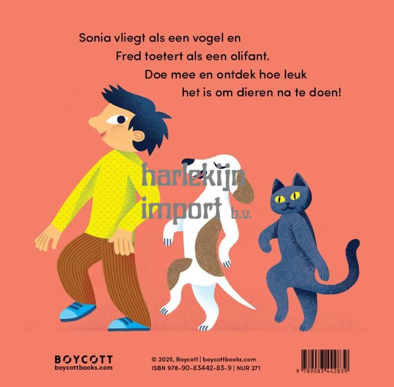 Vlieg als een vogel of toeter als een olifant! Dit interactieve kartonboekje moedigt kinderen aan om verschillende dieren na te doen. Met eenvoudige, vrolijke illustraties en uitnodigende teksten ontdekken peuters spelenderwijs hoe leuk het is om dieren te imiteren! Wie doet er mee?