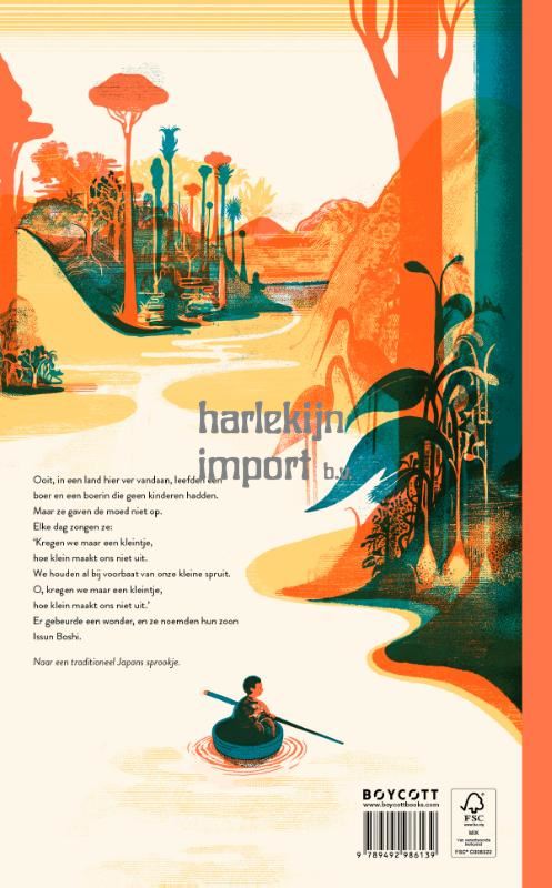 Issun Boshi is dan wel zo klein als een duim, zijn dapperheid is onmetelijk groot! Met een soepkom als zijn boot en een naald als zijn zwaard, trekt hij de wijde wereld in. Als hij het hart van een prinses probeert te veroveren, stelt een monster hem zwaar op de proef. Issun Boshi weet zich zo moedig te gedragen dat hij het monster verslaat en de prinses als een blok voor hem valt. In slechts drie kleuren illustreert het duo Icinori een werkelijk adembenemend landschap dat een gloednieuwe twist geeft aan het eeuwenoud internationaal bekend sprookje, Klein Duimpje.