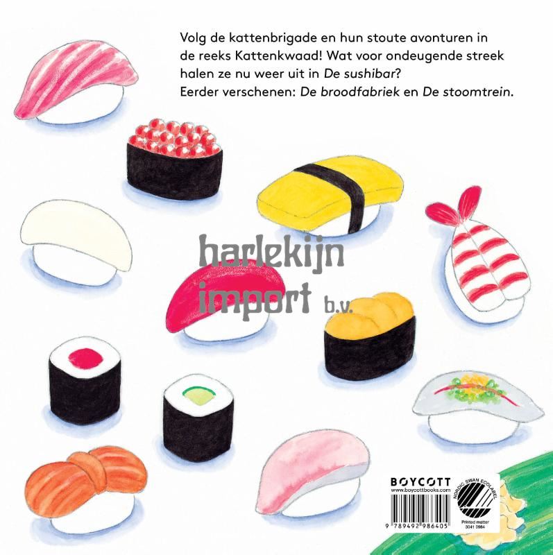 Miauw! De wilde kattenbrigade heeft het deze keer gemunt op een sushibar. Als de nacht valt, voeren ze hun snode plannetje uit. Ze breken in en graven een tunnel voor de sushibaan zodat alle lekkere hapjes direct bij hen zullen uitkomen. Maar dan… BOEM! De katten hebben een waterleiding geraakt en het restaurant is een zwembad geworden. Wie roept deze acht stoute katten tot de orde? Volg de ondeugende streken van een groepje rebelse katten in de serie Kattenkwaad. Telkens komt de ondeugende bende op het hoogtepunt van hun kattenkwaad zwaar in de problemen en is het de vraag hoe ze het weer goed kunnen maken.