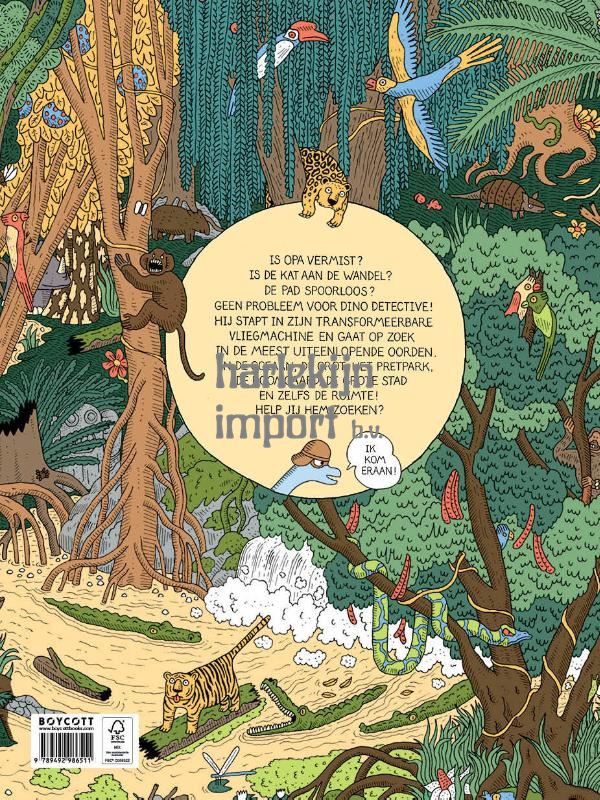 Spring aan boord van het rode vliegtuig van Dino Detective en reis de wereld rond, op zoek naar verloren dieren en mensen. Niets ontsnapt aan zijn oog dat zo scherp is als dat van een lynx: geen verloren kat in een dichtbebouwd middeleeuws dorp en geen opa in een labyrintisch museum... zeker niet als hij geholpen wordt door de lezer! Kun jij bijvoorbeeld de verloren blauwe pad van de prinses in de ondergrondse grot met duizend-en-een kamers vinden? Druk je neus dicht tegen dit boek aan om de duizelingwekkend gedetailleerde illustraties van Sophie Guerrive eens goed te bestuderen en Dino Detective te helpen. Een zoek- en vindboek vol verborgen grapjes, waar je niet op uitgekeken raakt!