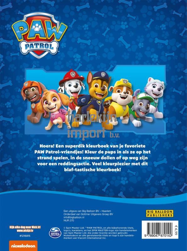 Hoera! Een 'Superdik kleurboek' van je favoriete PAW Patrol-vriendjes! Kleur de pups in als ze op het strand spelen, in de sneeuw dollen of ze op weg zijn voor een reddingsactie. Veel kleurplezier met dit blaf-tastische kleurboek! 'PAW Patrol' is een avontuurlijke en razend populaire animatieserie over een reddingsteam dat uit puppy's bestaat. De Nickelodeon-serie is gericht op peuters en kleuters en wordt wereldwijd in meer dan 170 landen uitgezonden. En dankzij de 'PAW Patrol'-boeken kunnen fans nu ook zónder scherm genieten van hun favoriete puppy's!