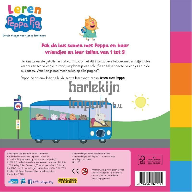 'Peppa's eerste telboek' is een educatief telboek, waarbij peuters en kleuters leren oefenen met tellen tot 5. Verplaats de schuifjes van een van Peppa Pig haar vriendjes als ze in de bus stappen en tel hoeveel er zijn. Tel ook andere dingen die je vindt in de afbeeldingen. Met kleurrijke illustraties en de bekende Peppa-personages is het een vrolijk boek om kennis te laten maken met de wereld van getallen. 'Leren met Peppa Pig' is een educatief uitgeefprogramma dat zich richt op jonge kinderen (vanaf 3 jaar). Er verschijnen uitgaven op het gebied van rekenen, schrijven, sociale vaardigheden, emoties en creativiteit. Peppa Pig is het schattige en ondeugende biggetje uit de gelijknamige wereldberoemde en razend populaire animatieserie. Ze woont samen met haar kleine broertje George, Mama Big en Papa Big en houdt van spelletjes spelen, verkleden, dagjes uit en in modderpoelen springen! Peppa's avonturen eindigen altijd goed en met een vrolijke knor.
