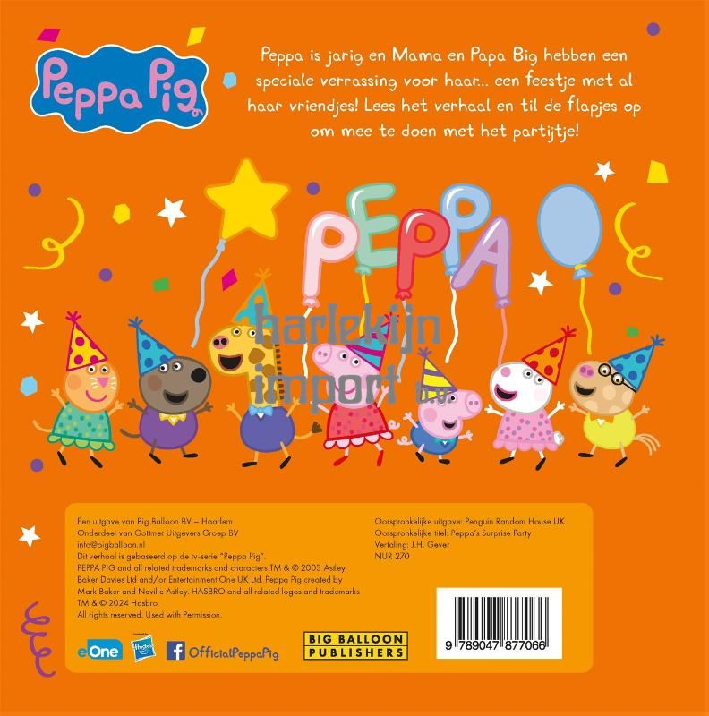 Het is feest, want 'Peppa Pig' is jarig in 'Peppa's verrassingsfeestje'! Dit interactieve prentenboek met flapjes barst van de vrolijkheid en maakt voorlezen nóg leuker. Mama en Papa Big hebben een speciale verrassing voor Peppa in petto: een feestje met ál haar vriendjes. Peppa staat in het middelpunt van belangstelling en jij kunt samen met haar alle verjaardagsverrassingen ontdekken. 'Peppa Pig' is het schattige en ondeugende biggetje uit de gelijknamige wereldberoemde en razend populaire animatieserie. Ze woont samen met haar kleine broertje George, Mama Big en Papa Big en houdt van spelletjes spelen, verkleden, dagjes uit en in modderpoelen springen! Peppa's avonturen eindigen altijd goed en met een vrolijke knor.