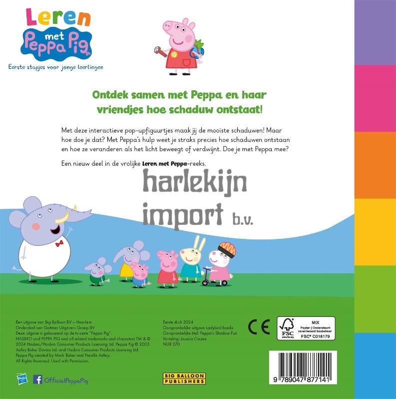 <p>Ontdek samen met Peppa en haar vriendjes hoe schaduw ontstaat in het nieuwe prentenboek 'Peppa's schaduwspelletjes'. Met de interactieve pop-up figuurtjes maak jij de mooiste schaduwen! Met Peppa's hulp weet je straks precies hoe schaduwen ontstaan en hoe ze veranderen als het licht beweegt of verdwijnt. Doe je met Peppa mee? <br><br><br><i>Leren met Peppa Pig</i> is een educatief uitgeefprogramma dat zich richt op jonge kinderen (vanaf 3 jaar). Er verschijnen uitgaven op het gebied van rekenen, schrijven, sociale vaardigheden, emoties en creativiteit. <br>Peppa Pig is het schattige en ondeugende biggetje uit de gelijknamige wereldberoemde en razend populaire animatieserie. Ze woont samen met haar kleine broertje George, Mama Big en Papa Big en houdt van spelletjes spelen, verkleden, dagjes uit en in modderpoelen springen! Peppa's avonturen eindigen altijd goed en met een vrolijke knor. <br><br>Bekijk ook de rest van onze collectie <i>Leren met Peppa Pig: </i>'Peppa's eerste telboek', 'Peppa's patronen en vormen', 'Peppa's kleine kuikentjes'.</p>