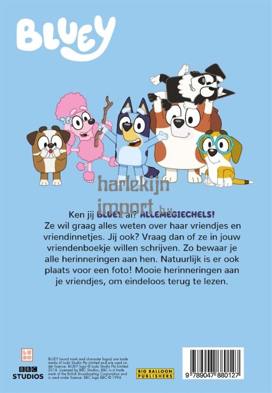 Allemegiechels! Bluey heeft nu zelfs haar eigen 'Bluey's vriendenboek'! Wil jij ook graag alles weten over jouw vriendjes, vraag dan of ze in jouw vriendenboekje willen schrijven. Zo kun jij de mooiste herinneringen altijd teruglezen. In een vriendenboek kunnen al je vrienden en vriendinnen leuke weetjes over zichzelf vertellen. Wanneer zijn ze bijvoorbeeld jarig? Wat willen ze later worden? Wat eten ze het liefst, welke film vinden ze het leukst en hoe hebben jullie elkaar leren kennen? Natuurlijk is er ook ruimte voor een leuke foto. En als je het boekje goed bewaart, wordt het een mooie herinnering voor later. Bluey is een lieve en energieke puppy die samen met haar zusje Bingo en hun vader en moeder woont. Door haar eindeloze energie en fantasie beleeft ze bijzondere avonturen en wordt er veel gespeeld en gelachen met haar vrienden en familie. Wist je dat er nog meer boeken zijn van Bluey? Lees ook 'Omaatjes', 'Zullen we een spelletje doen?' en 'Bedtijd met papa'.