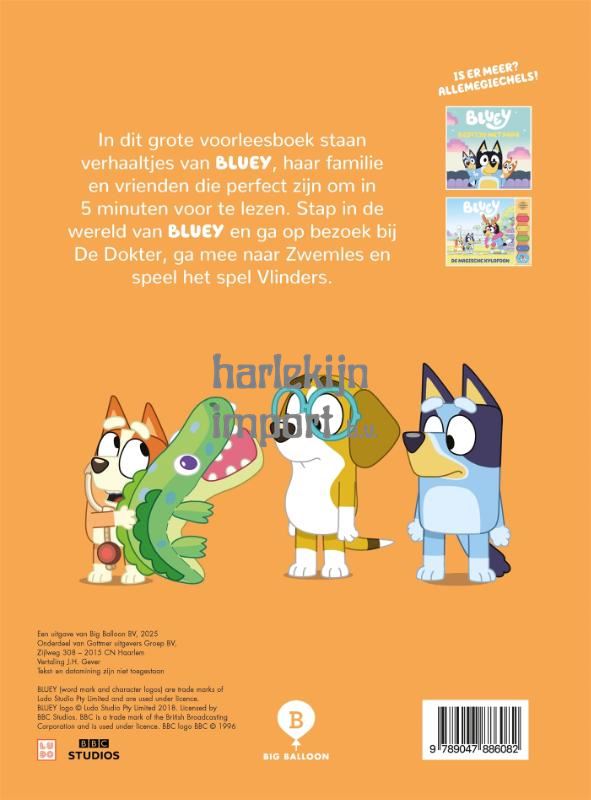 <p>'Het grote voorleesboek' van Bluey is een vrolijk en toegankelijk voorleesboek voor kinderen vanaf 2 jaar, met zes korte verhaaltjes om samen te lezen. Deze verhalen zijn precies binnen vijf minuten voor te lezen, waardoor ze uitstekend passen in het dagelijkse slaapritueel of een rustig momentje tussendoor.<br><br>In dit boek beleef je met Bluey en haar zusje Bingo allerlei avonturen. Ze spelen zwemschooltje, bezoeken de dokter en maken zelfs een robot van hun papa, die hun kamer moet opruimen - maar dat gaat natuurlijk niet helemaal volgens plan! De herkenbare situaties en de vrolijke illustraties maken dit voorleesboek leuk voor jonge kinderen.<br><br>'Het grote voorleesboek' is een absolute must-have voor jonge Bluey-fans en alle kinderen die houden van korte, toegankelijke en gezellige voorleesverhalen.</p>