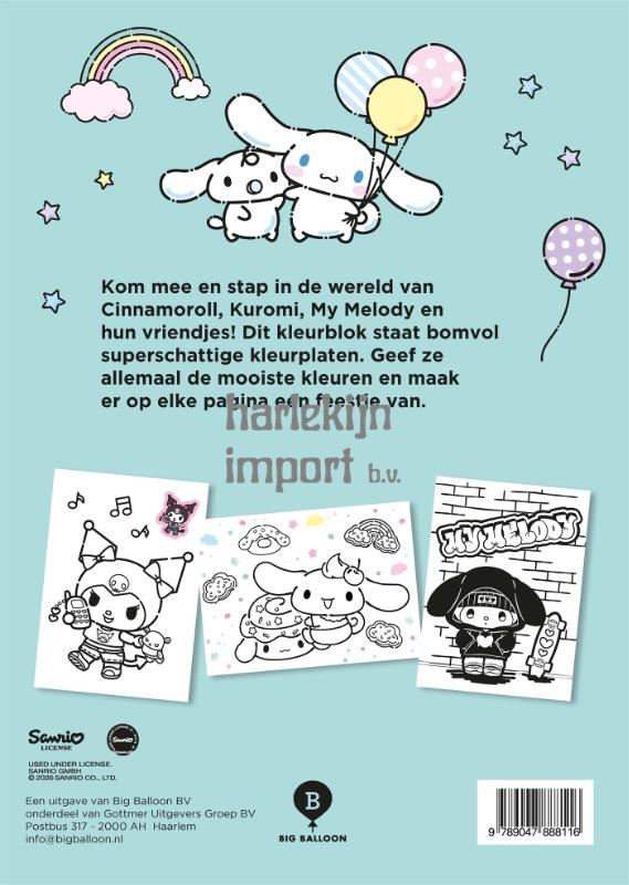 Maak kennis met de vrienden van Hello Kitty in het kleurblok 'Kleuren met Kuromi, Pompompurin, My Melody'. Kom mee en stap in de wereld van Cinnamoroll, Kuromi, My Melody en hun vriendjes! Dit kleurblok staat bomvol superschattige kleurplaten. Geef ze allemaal de mooiste kleuren en maak er op elke pagina een feestje van. Dit is een leuk boek voor kinderen vanaf 2 jaar. Wat is er nou fijner dan een middagje kleuren aan de keukentafel? Met een kleur- of doeboek ontwikkelen kinderen niet alleen hun motoriek, maar ook hun creativiteit en fantasie. En ze maken nog iets moois ook! Hello Kitty is een van de belangrijkste karakters van Sanrio. Samen met haar vriendjes zoals Cinnamoroll, Kuromi en My Melody brengen ze waarden als vriendelijkheid, vriendschap en vreugde. De aantrekkelijke kawaii-trend is populair door de schattige en lieflijke personages die positiviteit uitstralen. De aantrekkingskracht van kawaiicultuur schuilt in het vermogen om geluk en troost te brengen. De zachte, schattige ontwerpen van Sanrio-personages passen perfect bij deze culturele trend en maken ze populair bij fans die van alles wat schattig is houden.