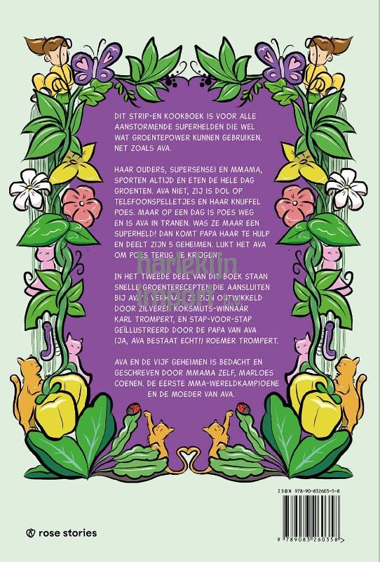 Dit strip-en kookboek is voor alle aanstormende superhelden die wel wat groentepower kunnen gebruiken. Net zoals Ava. Haar ouders, Supersensei en MMAma, sporten altijd en eten de hele dag groenten. Ava niet, zij is dol op telefoonspelletjes en haar knuffel POES. Maar op een dag is POES weg en is Ava in tranen. Was ze maar een superheld! Dan komt papa haar te hulp en deelt zijn 5 geheimen. Lukt het Ava om POES terug te krijgen? In het tweede deel van dit boek staan snelle groenterecepten die aansluiten bij Ava’s verhaal. Ze zijn ontwikkeld door Zilveren Koksmuts-winnaar Karl Trompert, en stap-voor-stap geïllustreerd door de papa van Ava (ja, Ava bestaat echt!) Roemer Trompert. Ava en de vijf geheimen is bedacht en geschreven door MMAma zelf, Marloes Coenen. De eerste MMA-wereldkampioene en de moeder van Ava.