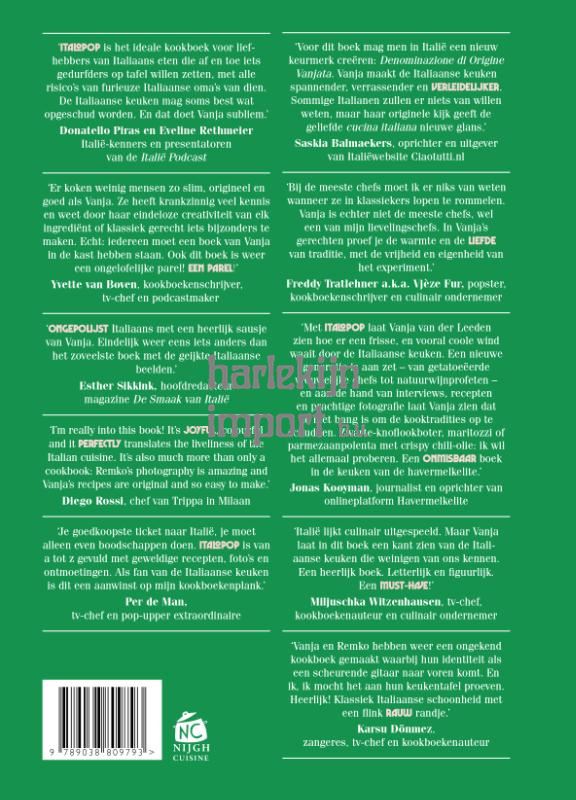 Van buffelmozzarella eten langs de snelweg naar Caserta tot op everzwijnen en paddenstoelen jagen met de jetset van Florence, het zijn belevenissen die Vanja en haar kookstijl voor altijd hebben beïnvloed. Italopop is een mix van haar jaren in Italië én haar jarenlange ervaring als kok. Samen met haar man en prijswinnend fotograaf Remko Kraaijeveld heeft Vanja de afgelopen jaren door Italië gereisd en kookte ze met chefs, ijsmakers en pizzabakkers die een frisse blik werpen op traditionele gerechten. Chefs die net als zij de ambitie hebben om de Italiaanse keuken alive, maar vooral kicking te houden. Het resultaat is een boek waar de levenslust en liefde voor Italië van afdruipt. Met smakelijke verhalen en verrassend Italiaans comfortfood: van gnocchi met boerenkool tot gevulde Sardijnse pasta, van Siciliaanse caponata met Indische knipoog en Romeinse next level carbonara tot drinkbare chocoladeporno uit Piemonte. De gerechten zijn geraffineerd trattoria-eten; kwalitatief, maar simpel. De Italiaanse keuken is immers een cucina popolare – een volkskeuken die voor iedereen toegankelijk is.