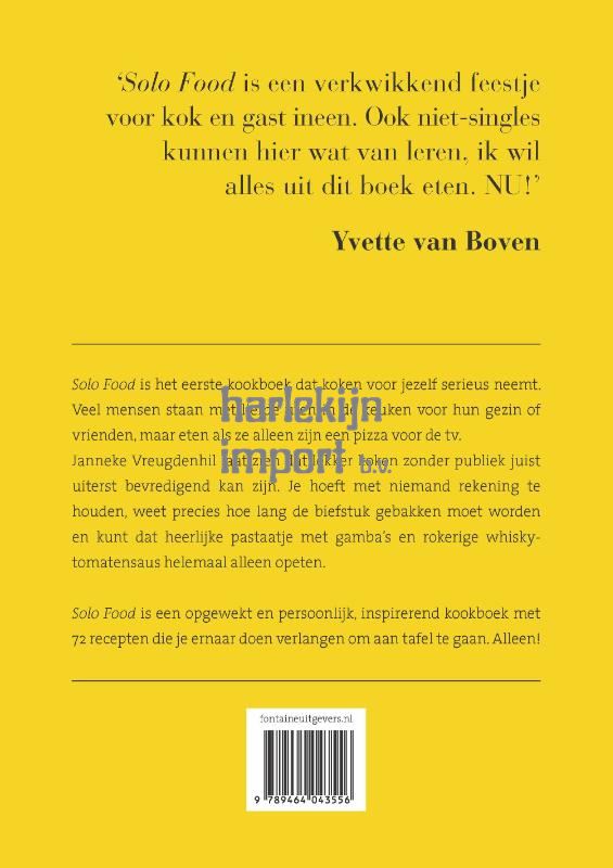 Meer dan 13.000 exemplaren verkocht! ‘Solo Food is een verkwikkend feestje voor kok en gast ineen. Ik wil alles uit dit boek eten. NU!’- Yvette van BovenNa haar echtscheiding hervond Janneke Vreugdenhil het genot van koken voor zichzelf. Met Solo Food, het boek waarin ze haar eenpersoonsrecepten verzamelde en dat herdruk na herdruk beleefde, wordt koken voor een eenpersoonshuishouden een feest. Janneke laat zien dat lekker koken zonder publiek bevredigend kan zijn. Je hoeft met niemand rekening te houden, weet precies hoe lang je de biefstuk gebakken wilt hebben en kunt dat heerlijke pastaatje met gamba’s en rokerige whisky-tomatensaus helemaal alleen opeten. Een opgewekt en persoonlijk kookboek met 72 recepten die je ernaar doen verlangen om in je eentje aan tafel te gaan. * Recepten voor snelle maaltijden, Netflix-dinners en solo comfort food* Ontbijt, lunch, diner, dessert en tussendoor * Van 10 minuten pho en Pasta aglio olio tot eenpersoons kaasfondue en mango-kokosijs Zoals Janneke zelf zegt: ‘Koken voor jezelf is niets meer of minder dan een exercitie in houden van jezelf.’