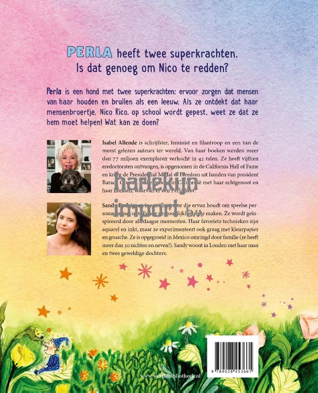Allereerste kinderboek van internationaal bestsellerauteur Isabel Allende. Perla heeft twee superkrachten. Is dat genoeg om haar geliefde Nico te redden? Perla is een hond met twee superkrachten: ervoor zorgen dat mensen van haar houden en héél erg hard blaff en. Als ze ontdekt dat haar mensenbroertje, Nico Rico, op school wordt gepest, weet ze dat ze hem moet helpen! Wat kan ze doen? Superbestsellerauteur Isabel Allende maakt haar kinderboekendebuut met dit betoverende en grappige verhaal over de band tussen een jongetje en zijn huisdier. Dit verhaal heeft ook een mooi persoonlijk tintje, want Isabel Allende bezit zelf meerdere honden, waarvan er een Perla heet. In 2025 en 2026 volgen nog twee kinderboeken: Perla en de prinses en Perla en de piraat.