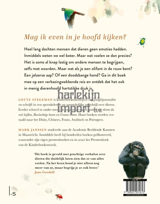 Leer de emoties van dieren begrijpen aan de hand van Ik voel ik voel wat jij niet ziet van Lotte Stegeman. Mark Janssen maakte de prachtige illustraties voor dit standaardwerk voor kinderen over het verborgen gevoelsleven van dieren. Met een uitgebreid en persoonlijk voorwoord van antropoloog en bioloog Jane Goodall. Heel lang dachten mensen dat dieren geen emoties hadden. Inmiddels weten we wel beter. Maar wat voelen ze dan precies? Het is soms al knap lastig om andere mensen te begrijpen, gelukkig hebben wíj daar woorden voor. Maar wat als je een olifant in de rouw bent? Een jaloerse aap? Of een doodsbange hond? In een sprankelende en aanstekelijke vertelstijl neemt Lotte Stegeman je mee op een verbazingwekkende reis en ontdek je dat het ook in menig dierenhoofd hartstikke druk is… Inclusief QR-codes met fascinerende filmpjes over dierenemoties! ‘Dit boek is gevuld met prachtige verhalen over dieren die duidelijk laten zien dat ze van alles voelen, net als wij. Je ontmoet treurende chimpansees en orka’s, blije parkieten, jaloerse apen, zorgzame en liefdevolle honden en nog veel meer. Na het lezen hou je niet alleen nog meer van ze, maar begrijp je ze ook beter.’ Jane Goodall