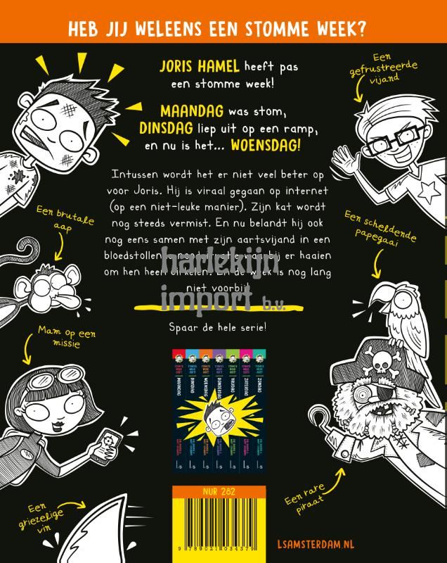 Joris Hamel beleeft zijn stomste week ooit. Na Maandag en Dinsdag belooft ook Woensdag een ramp te worden. In deze graphic-novelserie van Eva Amores en Matt Cosgrove volg je hem een week lang. Elke dag beslaat een boek, dus spaar de hele serie! Maandag was stom, dinsdag liep uit op een enorme ramp en nu is het… woensdag! Intussen wordt het er niet veel beter op voor Joris. Behalve dat zijn kat nog steeds op mysterieuze wijze is verdwenen, is Joris een ware sensatie op internet geworden. Bovendien belandt hij nu ook nog eens samen met zijn aartsvijand in een bloedstollende noodsituatie waarbij er haaien om hen heen cirkelen. En de week is nog lang niet voorbij!