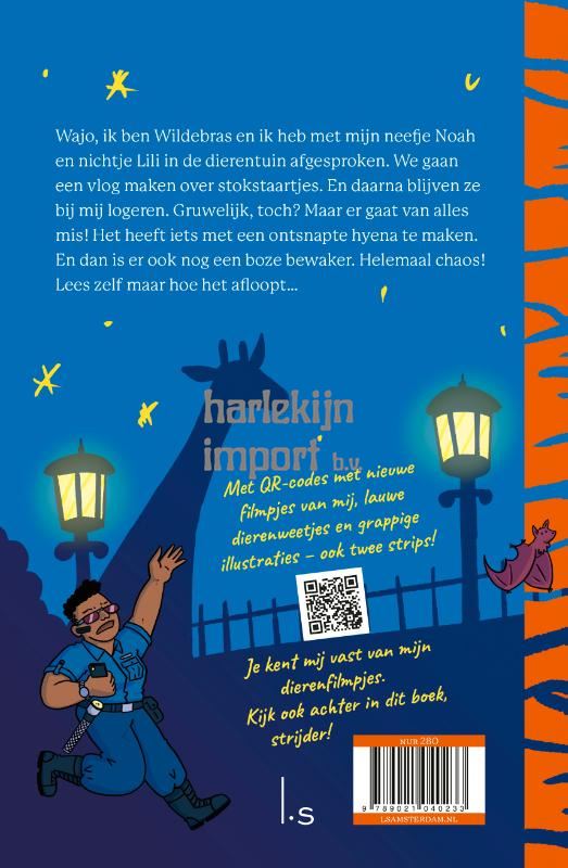 Gabriel Martina is een populaire influencer en TikTok-fenomeen onder de naam Wildebras. Wilde avonturen van Wildebras – Een nacht in de dierentuin is zijn eerste jeugdboek met een grappig en spannend avonturenverhaal, vol fullcolourillustraties, QR-codes naar nieuwe filmpjes en superinteressante weetjes over dieren! Wildebras gaat samen met zijn neefje en nichtje naar de dierentuin. Ze zijn zo druk bezig met het filmen van stokstaartjes dat ze te laat ontdekken dat het na sluitingstijd is en ze alleen zijn achtergebleven. Geen nood, nu kunnen ze rustig hun lievelingsdier bekijken: de gevlekte hyena. Maar door een ongelukje belanden de kinderen achter het hek van een van de sterkste strijders uit het dierenrijk. Wildebras moet ze nu gauw zien te redden. Door pech gaat er van alles mis en voor hij het weet komt hij terecht in een nachtelijke achtervolging door de hele dierentuin… Wildebras is met zijn safarihoedje een bekende onlineverschijning. Hij is een van de populairste dierenliefhebbers van dit moment en is een graag geziene gast in allerlei mediaprogramma’s. Met zijn grappige filmpjes in straattaal weet hij kinderen zijn liefde voor dieren en de natuur bij te brengen. ‘Wildebras heeft een unieke aanpak als het aankomt op het vertellen van verhalen over dieren.’ LINDA.nl