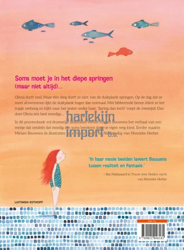 Olivia durft alles. Maar in Olivia durft, het betoverende prentenboekendebuut van illustrator Miriam Bouwens, ontdekt ze tijdens zwemles dat er iets is wat ze niet durft. Een heerlijk eigenwijs prentenboek met een belangrijk thema: je grenzen durven aangeven. Olivia zit op zwemles. Drijven op haar rug, watertrappelen en onder water zwemmen als een vis – ze kan het allemaal. Maar van de duikplank springen durft ze niet. Op de dag dat ze moet afzwemmen lijkt de duikplank nog hoger dan normaal. Langzaam klimt ze het trapje omhoog, haar benen bibberen. Dan doet ze iets heel moedigs… In dromerige zinnen en betoverende illustraties vertelt Miriam Bouwens het verhaal van een meisje dat ontdekt dat moedig zijn soms betekent dat je je eigen weg kiest. ‘In haar mooie beelden laveert Bouwens tussen realiteit en fantasie.’ Bas Maliepaard, Trouw