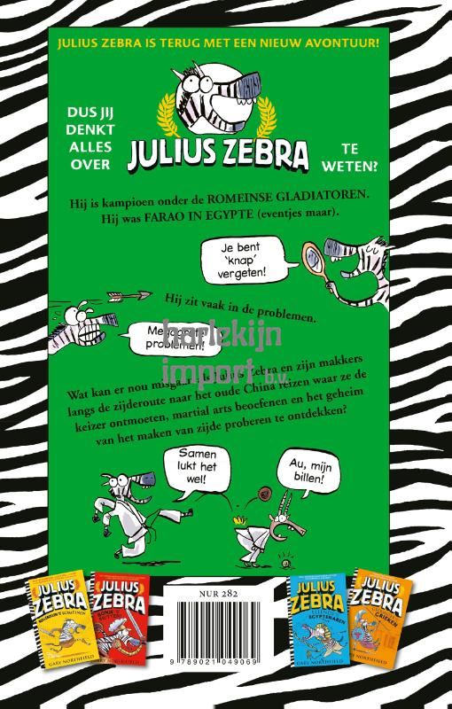 In Ophef in het oude China, het vijfde deel in de Julius Zebra-serie van Gary Northfield, treedt de zebragladiator in de voetsporen van Marco Polo. Eerder verschenen in deze supergrappige graphic-novelserie: Rollebollen met de Romeinen, Bonje met de Britten, Ellende met de Egyptenaren en Gedonder met de Grieken. De boeken zijn los van elkaar te lezen. Julius en zijn makkers hebben hun missie voor Herakles met succes voltooid en reizen nu af naar het oude Chinese rijk. Hun doel: het geheim van het maken van zijde ontdekken. Makkie, toch? Wat kan er nou misgaan als ze zich als een gigantische draak moeten verkleden, een woest potje voetbal bij de Chinese Muur moeten spelen en het tegen een beruchte martial art-meester moeten opnemen? Om niet te spreken van hun geniale plan om Milus de leeuw als vlieger te vermommen om zijderupsen te stelen… Met achterin extra informatie over het oude Chinese rijk! ‘Ik houd heel erg van actie, humor en fantasie en dat zit hier allemaal in. Heel grappig: alle paginanummers staan in Romeinse cijfers.’ Yassin, 10 jaar, in Kidsweek over Gedonder met de Grieken