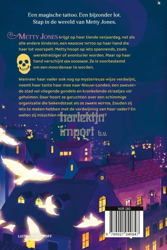 Laat je meeslepen in dit magische avontuur over Metty Jones, die op zoek naar haar verdwenen vader een belangrijke ontdekking doet over zichzelf. Dit eerste deel van de Vloek van inkt-serie van Philippa Leathley is ronduit spannend en betoverend! Op haar tiende verjaardag krijgt Metty, net als alle kinderen, een magische tattoo op haar hand. Deze tattoo zegt iets over haar lot. Metty hoopt op iets spannends, zoals wereldreiziger, ontdekker of avonturier worden. Maar op haar hand verschijnt een doodskop. Ze is voorbestemd om een moordenaar te worden. Na haar verjaardag wordt ze door haar vader in een afgelegen huis op het platteland verborgen gehouden. Maar wanneer hij op mysterieuze wijze verdwijnt, wordt ze door haar merkwaardige tante meegenomen naar Nieuw-Londen, een zwevende stad met magische windfietsen, vliegende gondels en kronkelende straatjes die allerlei geheimen verbergen. Daar hoort ze geruchten over een schimmige organisatie die bekendstaat als de Zwarte Motten, en ze krijgt al snel het vermoeden dat die iets te maken heeft met haar vaders verdwijning, en misschien ook wel met haar eigen lot…