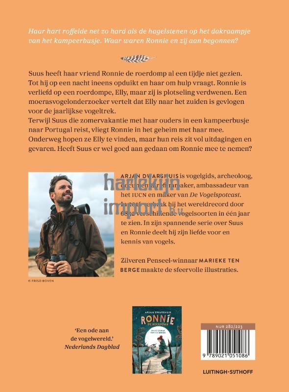 Na Ronnie de roerdomp en het geheim van het moeras van vogelaar Arjan Dwarshuis, bekend van De Vogelspotcast, gaan de avonturen van Ronnie en Suus verder in deel 2: Ronnie de roerdomp slaat zijn vleugels uit. Opnieuw een aanstekelijke jeugdroman over de wereld van (trek)vogels, met prachtige illustraties van Zilveren Penseel-winnaar Marieke ten Berge. Suus heeft haar vriend Ronnie de roerdomp al een tijdje niet gezien. Tot hij ineens tijdens een warme zomernacht opduikt en haar om hulp vraagt. Ronnie is verliefd geworden op een roerdompe, Elly, maar zij is plotseling verdwenen. Gelukkig weet een moerasvogelonderzoeker er meer van: Elly is naar het zuiden gevlogen voor de jaarlijkse vogeltrek. Terwijl Suus die zomervakantie met haar ouders in een camper naar Portugal reist, vliegt Ronnie in het geheim met haar mee. Ze hopen onderweg Elly te vinden. Maar het wordt een reis vol gevaren, zoals jagers, bosbranden en aanhoudende droogte. Lukt het ze om de liefde van Ronnies leven terug te vinden?